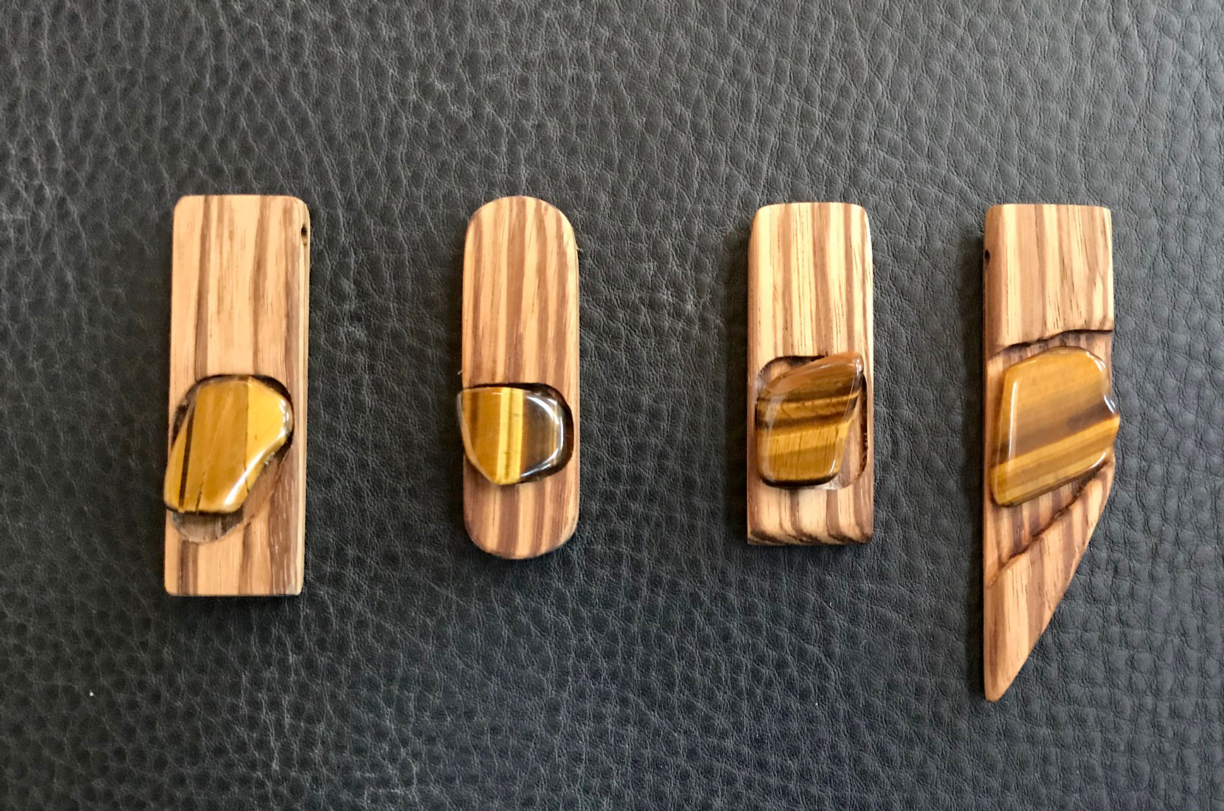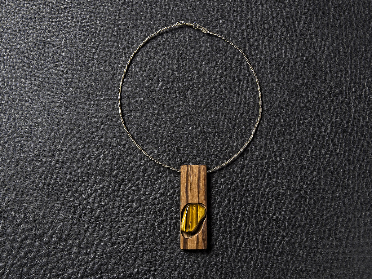 With its golden bands, flecks of sand, and smudges of inky black and brown – the artist found this to be the ideal match to Zebrawood. It enhances the Zebra woods exemplary beauty, while embracing the Tiger Eyes known power to protect the wearer from any harm.